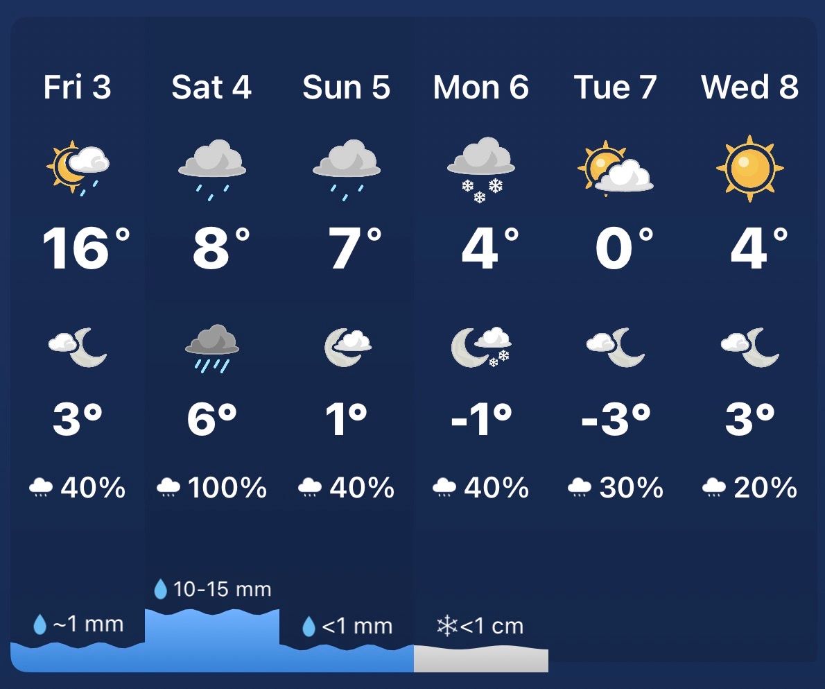 We’re getting a little bit of everything this week. A warmer Friday to start, then rain settles in through the weekend, followed by a colder snap early next week with a chance of flurries. Classic Niagara shoulder season.
