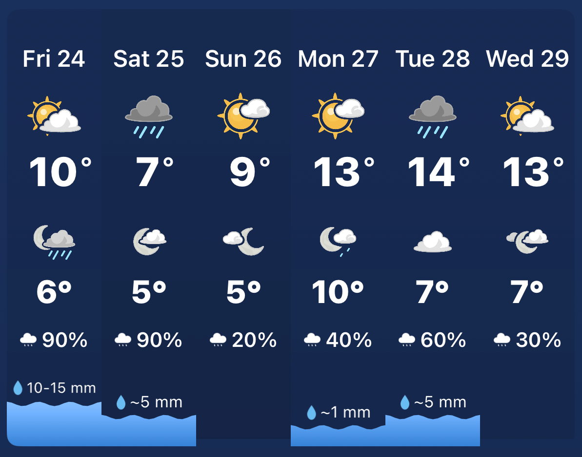 A mix of sun, clouds, and rain is rolling through NOTL this week, with cooler temps to start before climbing into the low teens. It’s not quite patio weather yet, but we’re getting close.